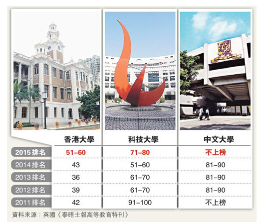 英国《泰晤士报高等教育特刊》公布2015世界大学名气榜,中国香港3所2014年上榜的大学,排名全数显著下跌,香港大学由第43位跌至51-60位,香港科技大学及香港中文大学是2011年有该排名榜以来,排名首次下跌,中大更由81-90跌至百名外。
