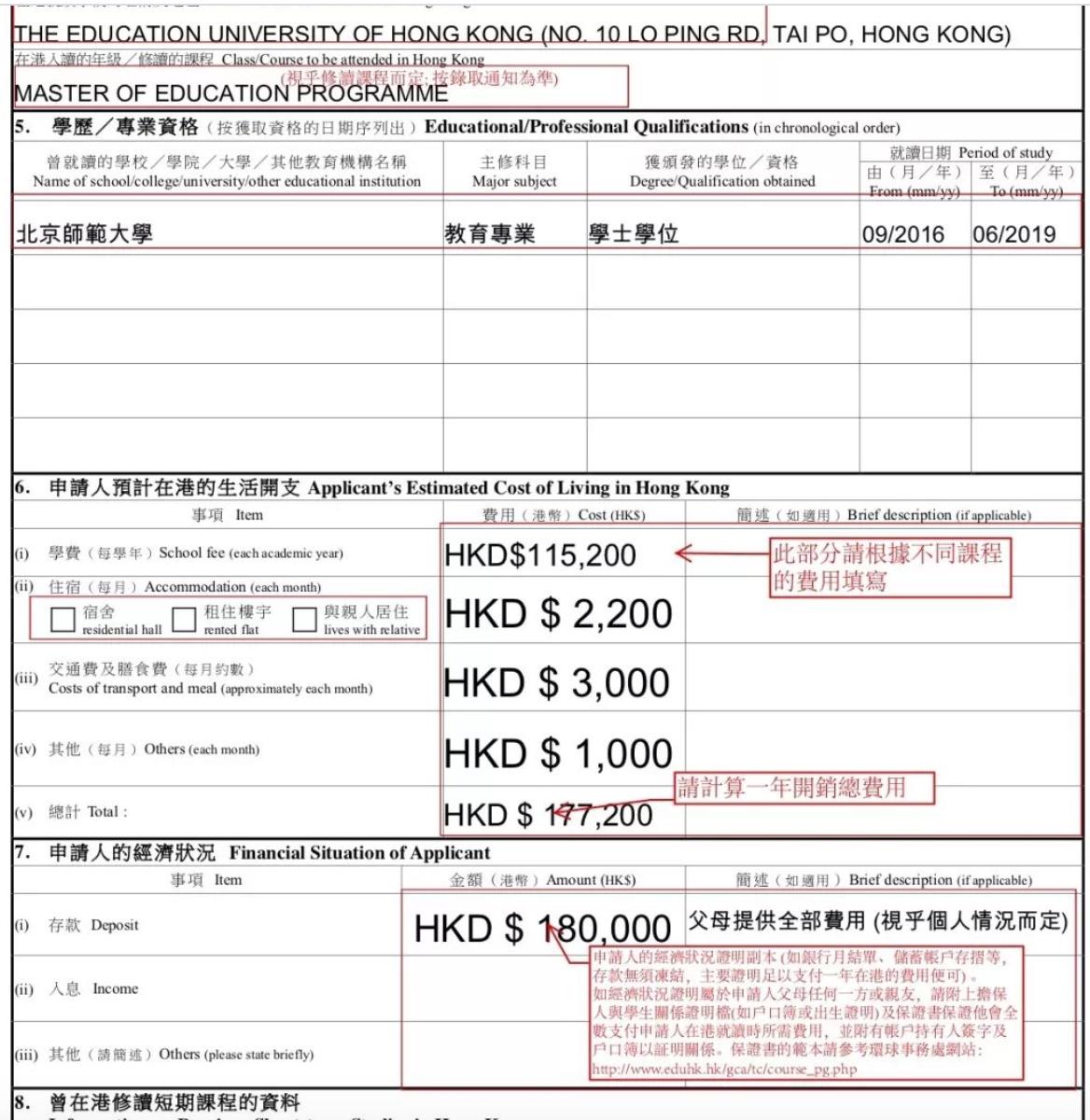 这两个部分因人而异。需要注意的是,生活开支需与存款证明相匹配,也就是生活开支的总和要小于或等于存款证明上的数字。如果已经预先交了一笔留位费,也可以在“简述”处注明(例如“已缴付 HKD50,000留位费"),财产证明的金额就可以减去留位费的钱。