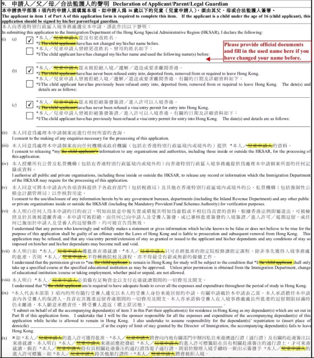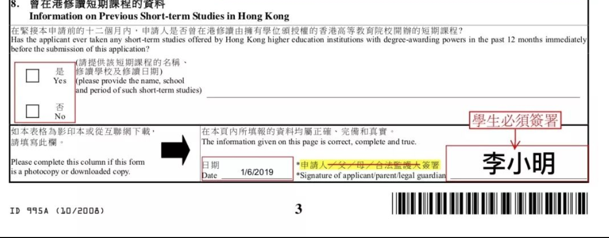 如实填写,大部分同学没有填“否”。如果曾经在香港就读过短期课程,则在此处如实填写就读学校,课程名称,以及就读时间。注意第3页也需要手写签名。
