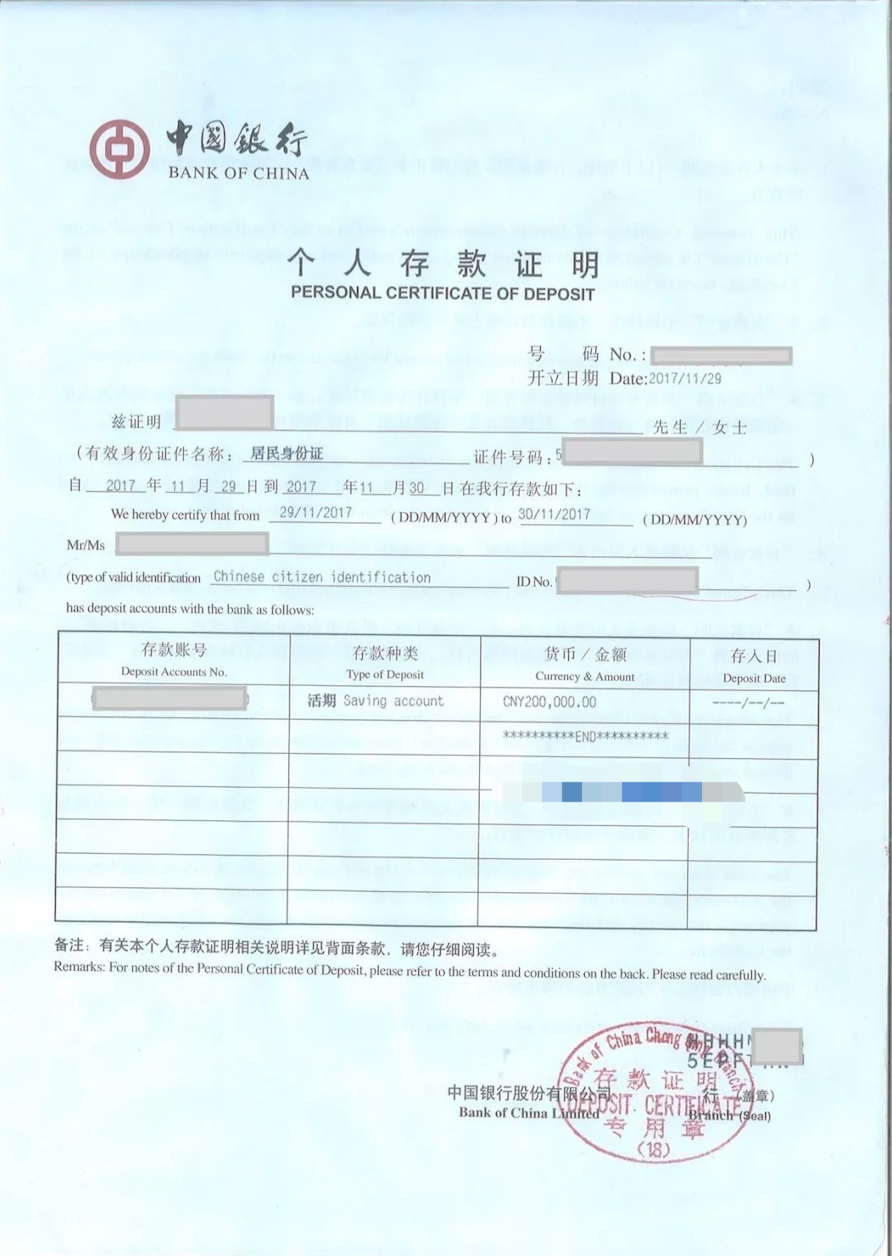 下面小编给大家提供2个范例做参考,第一个是中国银行开具的个人存款证明(时点证明),存款类型为活期存款,存期为2天。(当然定期存款也是可以的)
