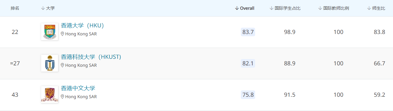首先,香港大学从去年的25位,上升到今年的22位;