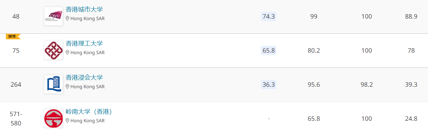 香港高校排名不仅坚挺,而且非常还有大幅度提升!香港大学、香港科技大学、香港中文大学、香港城市大学全部冲进前五十!特别是香港理工大学,从去年91位来到了今年的75位!这不仅显示出香港高校自身的综合实力,更表明香港高校在世界的认可程度已经达到足够的高度。