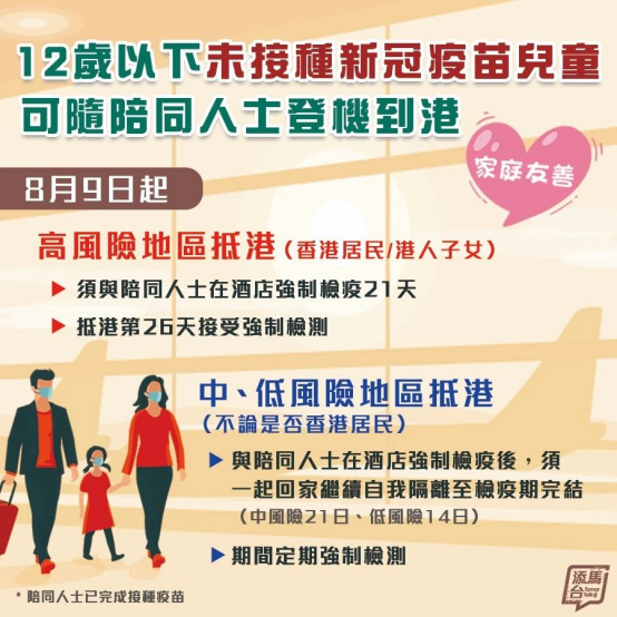 此外,港府于2021年8月5日公布因应最新情况调节及澄清从广东省以外其他内地地区、澳门及台湾来港人士的检疫及检测安排。政府于2021年8月7日进一步阐释适用于12岁以下小童的安排,以及加强适用于来自低风险地区人士的强制检测要求; 亦同时公布将由8月18日起,在机场为合资格抵港人士提供自费血清抗体测试服务。