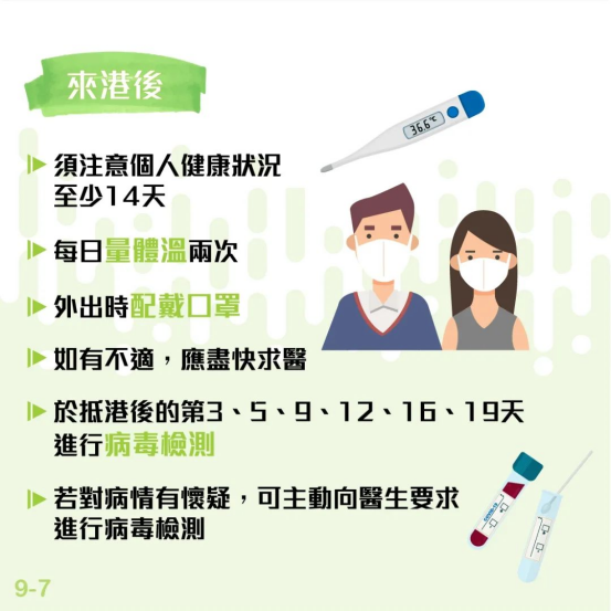 抵港后,大家须在第3天、第5天、第9天、第12天、第16天及第19天(如仍身处香港)到社区检测中心或认可的本地医疗检测机构接受强制核酸检测(第19天的检测必须在社区检测中心进行)。