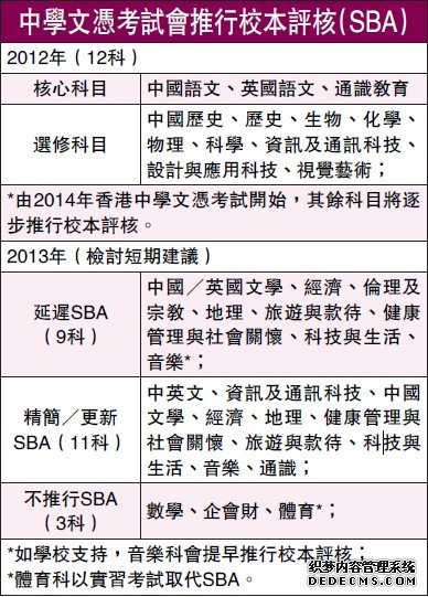 本次检讨另一亮点是,除9科延迟推行校本评核、11科精简及更新校本评核安排之外,数学、企会财和体育课不会推行校本评核。预计2013/14学年中四学生开始实施,2016年文凭试及以后考试生效。