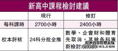 据香港大公报报道,回应香港学界批评实施4年的新高中课程课时严重不足而要不断补课,香港教育局昨天连同香港考评局公布检讨方案,提出短中期改善建议。短期建议包括将各科课时由2700小时改为以2400小时作中位数,不再坚持全部学科都要推校本评核,更即时宣布数学等3科取消SBA,局方更会设10个工作小组,包括研究中文科要不要重设文言文范文。