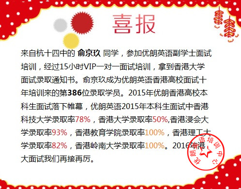 俞京玖同学来自杭十四中,参加优朗英语副学士面试培训,经过15小时VIP一对一面试培训,拿到香港大学面试录取通知书。俞京玖成为优朗英语香港高校面试十年培训来的第386位录取学员。2015年优朗香港高校本科生面试落下帷幕,优朗英语2015年本科生面试中香港科技大学录取率78%,香港大学录取率50%,香港浸会大学录取率93%,香港教育学院录取率100%,香港理工大学录取率82%,香港岭南大学录取率100%。2016年港大面试我们再接再厉。
