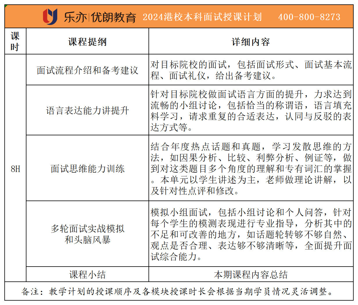 授课内容包括自我介绍,每年最新国内国际时事政治分析,历届港大面试真题的剖析,英语基本沟通能力提升、香港的大学面试技巧、思维应变能力训练,考场英语面试模拟等,多角度、全方位进行精细讲解和分析指导,使学生的语言组织能力、话题扩展和面试技巧得到飞速提高;同时组织学员进行多场真实场景模拟面试,在实战中分组讨论增强学生面试信心,让学员既练口语,也练胆量帮助考生在莘莘学子中脱颖而出。港大面试全国专线:400-800-8273