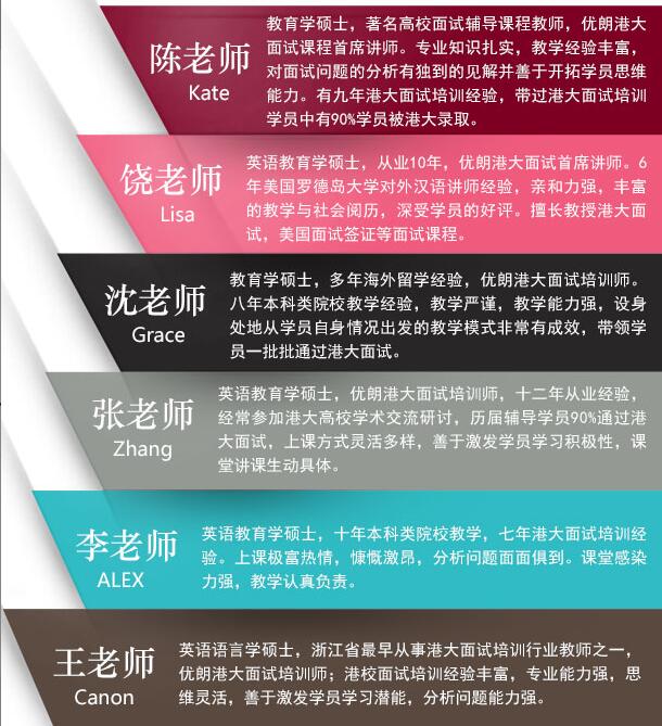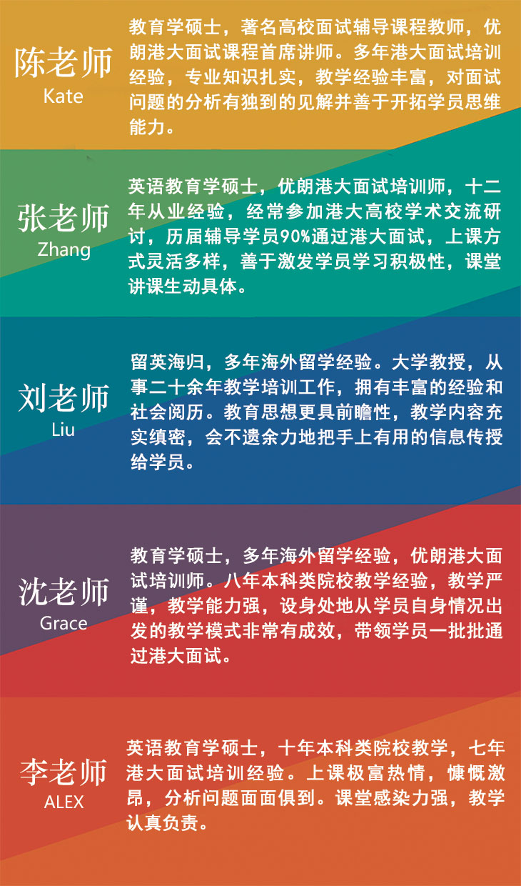 优朗国际英语自2006年开办港大面试培训以来,已连续举办了数百期针对港校大学高三本科生面试,香港大学研究生面试,香港大学卓越计划面试,香港科技大学校长推荐计划面试的专项培训课程,顺利帮助众多学子成功进入香港大学、 香港科技大学 香港理工大学、香港理工大学、香港树仁大学 、香港教育学院等港校就读。授课教师不仅对港校文化、高校面试均有非常丰富经验,同时我们对香港各所大学面试要求及高校面试信息把握精准,确保学员在最短时间内高效做好最充分的语言能力提升及面试技巧准备。