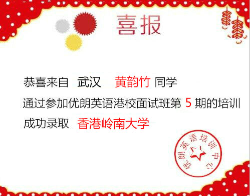 优朗国际英语2017年港校面试培训班再创佳绩,恭喜来自湖北武汉市洪山高级中学黄韵竹同学录取香港岭南大学。