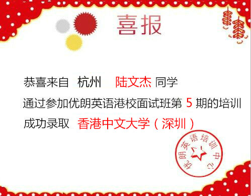 优朗国际英语2017年港校面试培训班再创佳绩,恭喜来自杭州浙大附中的陆文杰同学录取香港中文大学深圳校区。