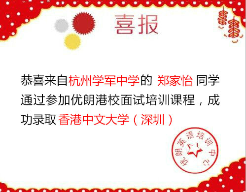 优朗国际英语2018年港校面试培训班再创佳绩,恭喜来自杭州学军中学的郑家怡同学录取香港中文大学(深圳)。