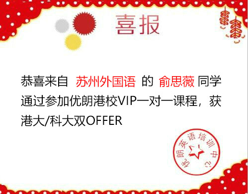 喜讯:苏州外国语国际生俞思薇获港大/科大双OFFER 发布时间:2019-03-20 15:35:52 阅读量: 优朗国际英语2019年港校面试培训班再创佳绩,恭喜来自苏州外国语国际生俞思薇同学获港大/科大双OFFER。 微信咨询:gangdams