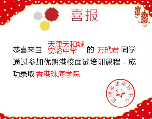【2019喜讯】天津天和城实验中学的万玳君同学录取香港珠海学院 发布时间:2019-07-16 10:02:52 阅读量: 优朗2019年港校面试培训班再创佳绩,恭喜来自天津天和城实验中学的万玳君同学录取香港珠海学院。 微信咨询:gangdams