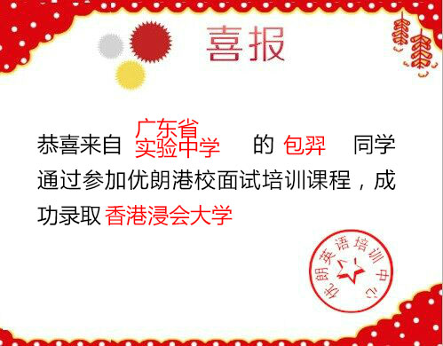 【2019喜讯】广东省实验中学的包羿同学录取香港浸会大学 发布时间:2019-07-16 10:13:39 阅读量: 优朗2019年港校面试培训班再创佳绩,恭喜来自广东省实验中学的包羿同学录取香港浸会大学。 微信咨询:gangdams