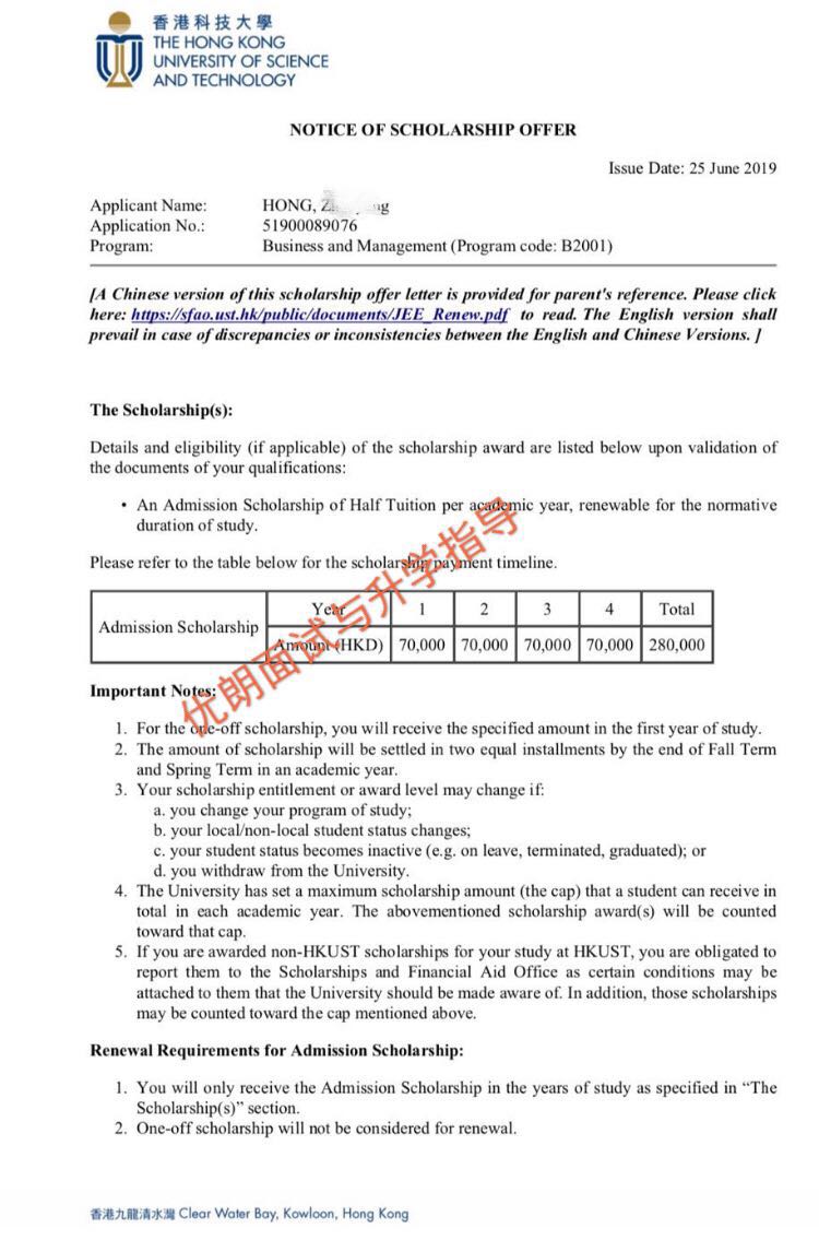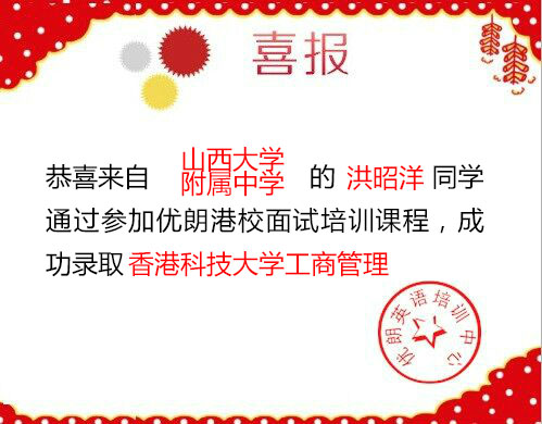 【2019喜讯】山西大学附属中学的洪昭洋同学录取港科大工商管理 发布时间:2019-07-17 09:23:56 阅读量: 优朗2019年港校面试培训班再创佳绩,恭喜来自山西大学附属中学的洪昭洋同学录取香港科技大学工商管理专业,并获4年28万元奖学金。 附:录取通知书截图↓ 微信咨询:gangdams