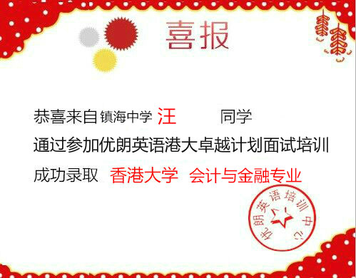 【2019喜讯】镇海中学的汪同学录取香港大学会计与金融专业 发布时间:2019-07-19 11:16:14 阅读量: 优朗2019年港校面试培训班再创佳绩,恭喜来自镇海中学的汪同学录取香港大学会计与金融专业。 微信咨询:gangdams