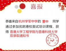 优朗2020年港校面试培训班再创佳绩,恭喜来自杭州学军中学 的董申 同学获香港大学工程学院与香港科技大学双录取通知书 。 微信 咨询 :gangdams
