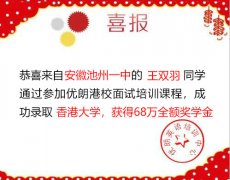 优朗2020年港校面试培训班再创佳绩,恭喜来自 安徽池州一中的王双羽同学录取香港大学,获香港大学68万全额奖学金。 微信 咨询 :gangdams
