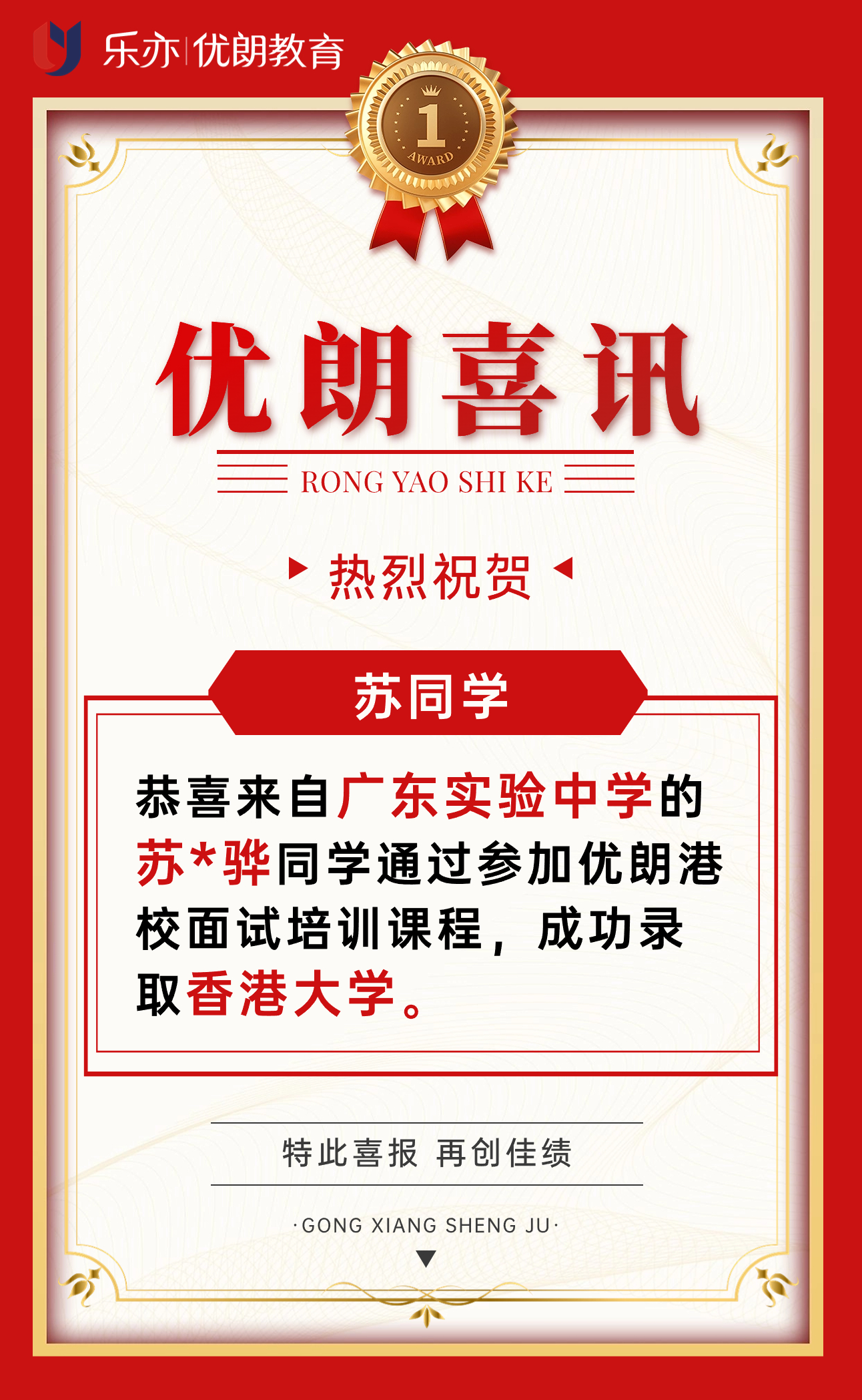 优朗2023年港校面试培训班再创佳绩,恭喜来自广东实验中学的苏*骅同学成功录取香港大学!优朗提供优质的升学规划、院校申请和面试辅导等一站式升学服务,可扫描下方二维码,添加顾问老师微信详情咨询!