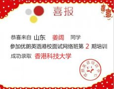 优朗国际英语2017年港校面试培训班再创佳绩,恭喜来自山东的姜阔 同学成功录取香港科技大学。