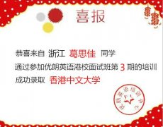 优朗国际英语2017年港校面试培训班再创佳绩,恭喜来自浙江的葛思佳 同学成功录取香港中文大学。