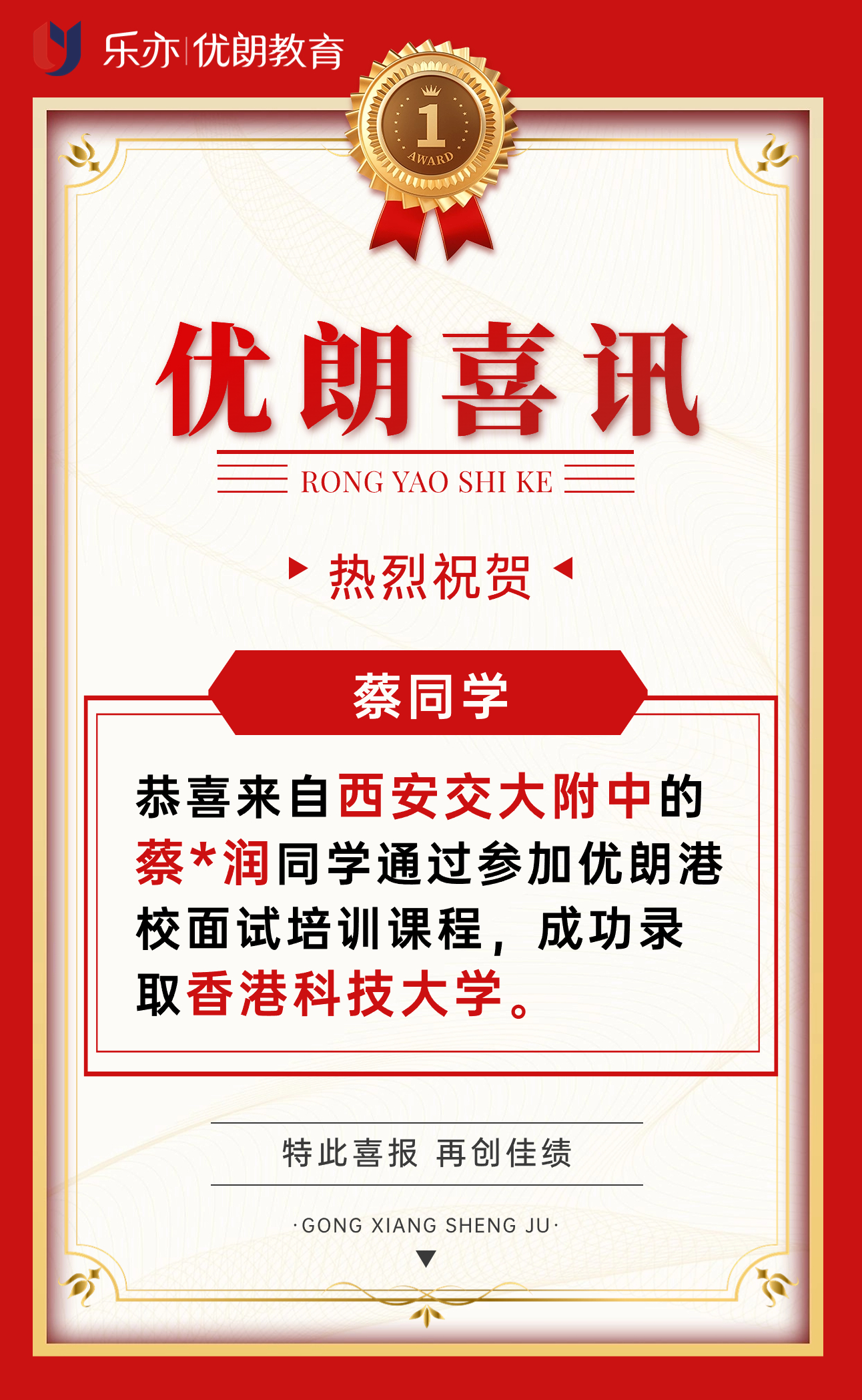 【2023喜讯】西安交大附中的蔡*润同学录取香港科技大