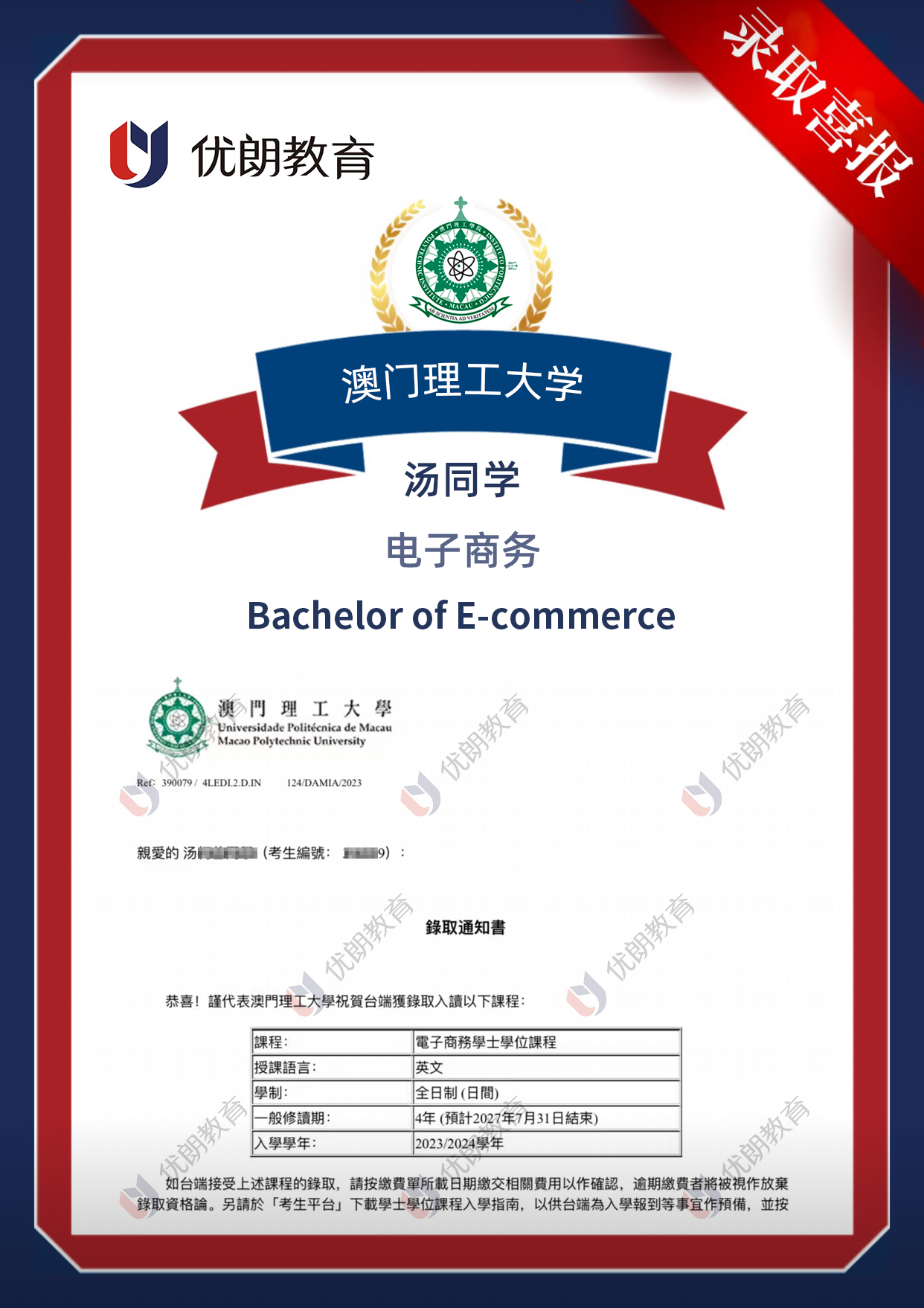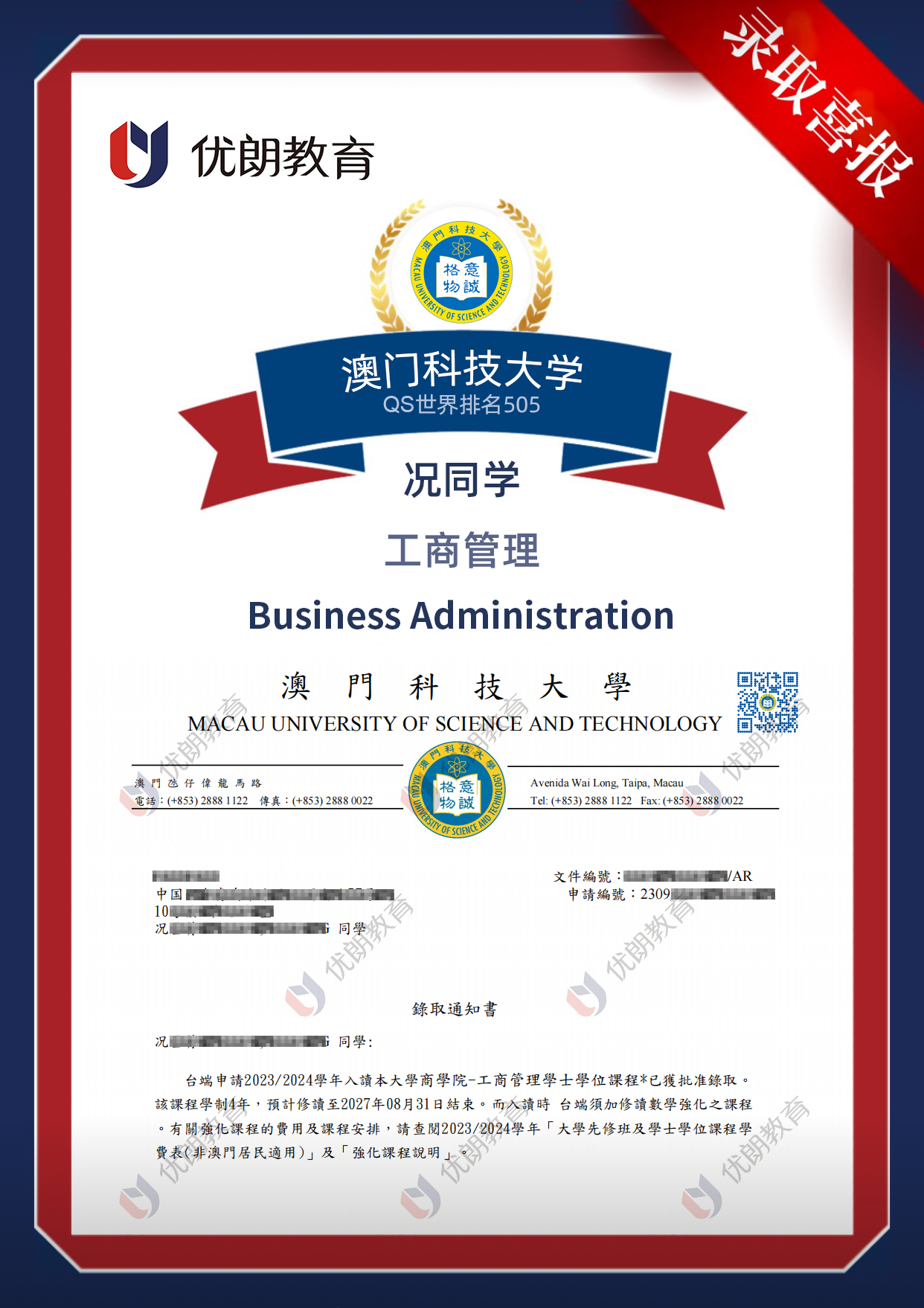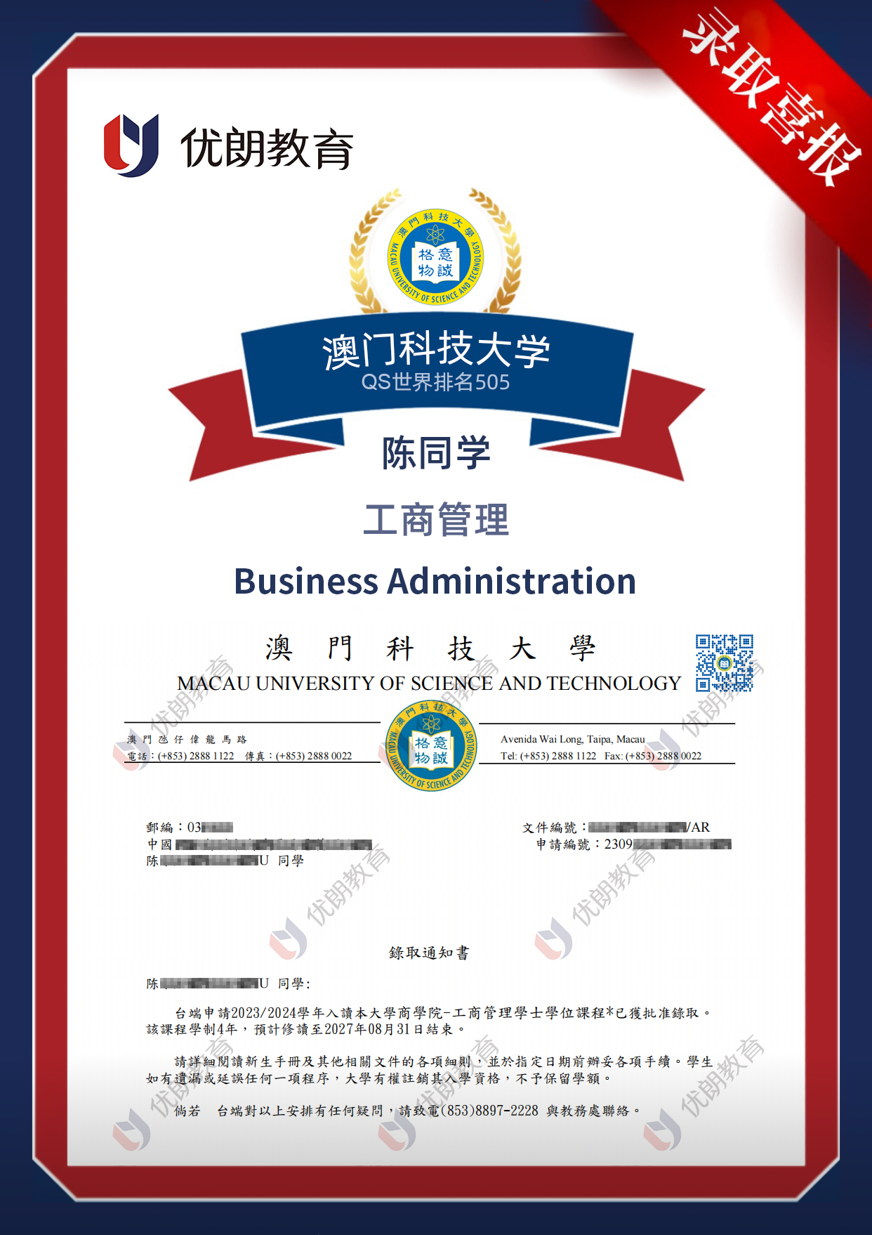 【喜报】陈同学成功录取澳门科技大学工商管理
