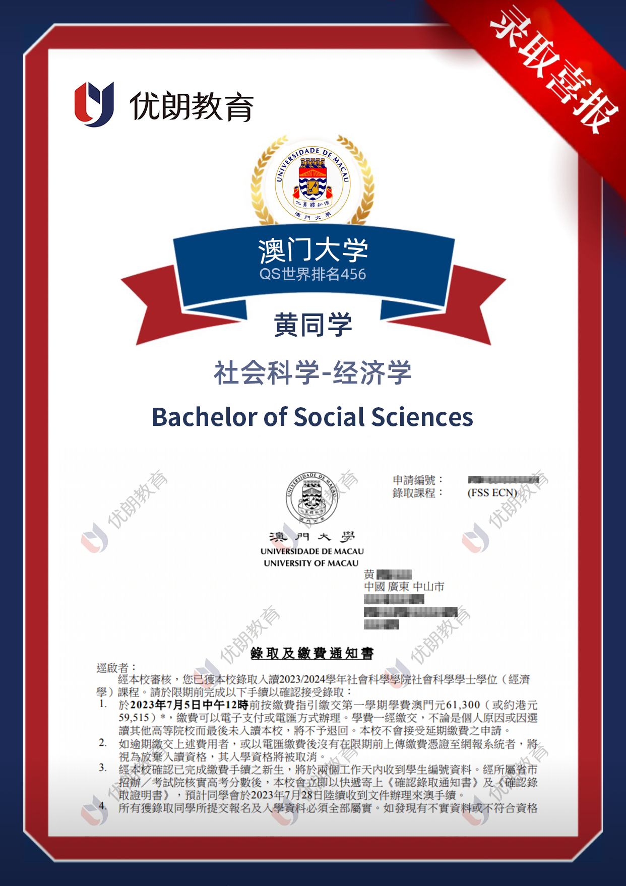【喜报】黄同学成功录取澳门大学社会科学-经济学