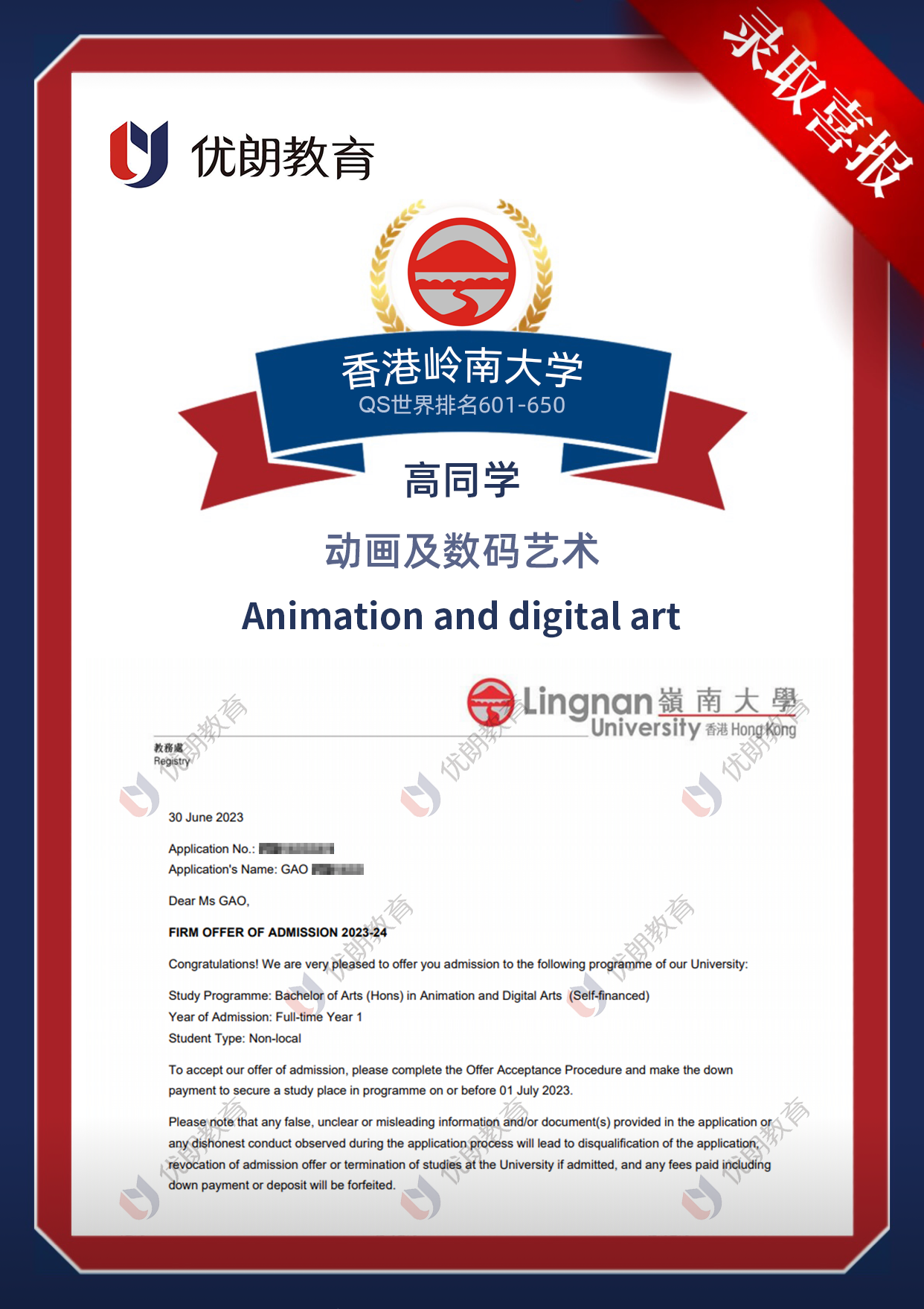 优朗2023年港校面试培训班再创佳绩,恭喜我们学员高同学成功录取香港岭南大学动画及数码艺术学士学位课程!优朗提供优质的升学规划、院校申请和面试辅导等一站式升学服务,可扫描下方二维码,添加顾问老师微信详情咨