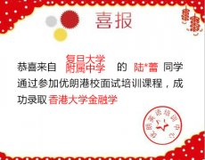 优朗2021年港校面试培训班再创佳绩,恭喜来自 复旦大学附属中学 的 陆*蕾 同学录取 香港大学金融学 。 微信 咨询 :gangdams