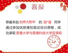 优朗2021年港校面试培训班再创佳绩,恭喜来自 北师大附中的周*昱同学获得香港大学与香港科技大学双录取 。 微信 咨询 :gangdams