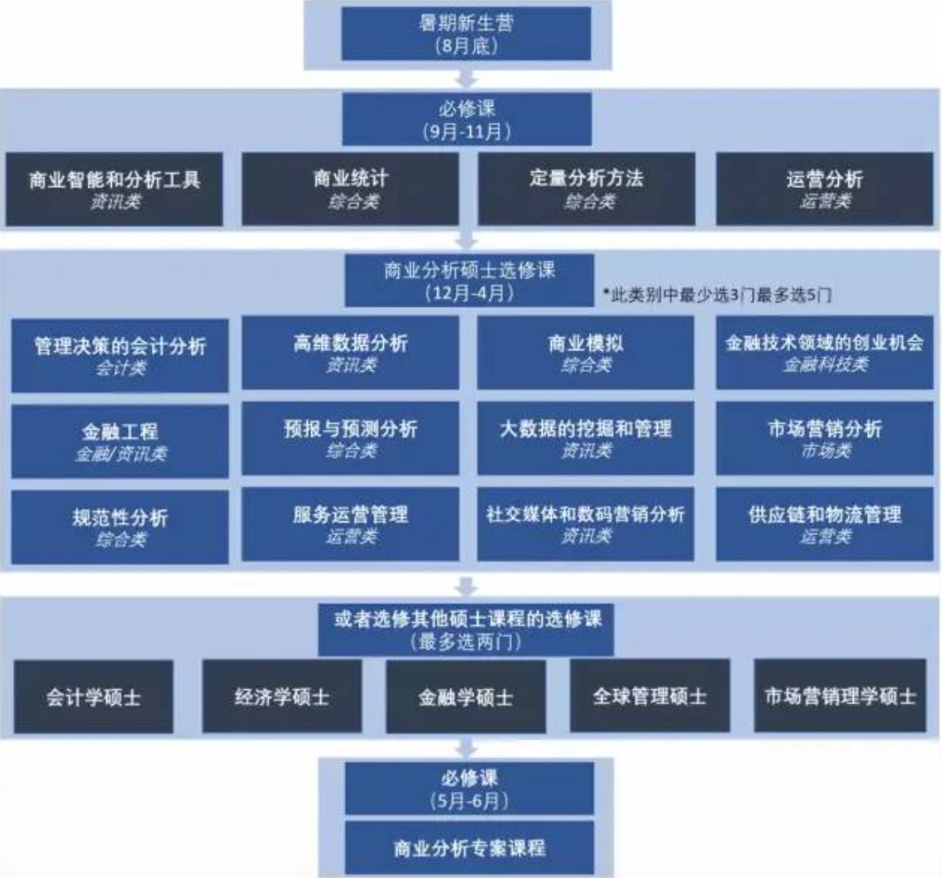 另外,由于商业分析课程每年招收来自不同学科背景的学生,为了确保同学可以在开学前有对新课程有大致的了解,本专业会在八月底专门为新生开设暑期训练营,旨在加强同学的基础知识和技能,来应对开学后的各个学科的挑战,暑期训练营所教授的知识将涵盖例如数学、编程、统计学与业务分析等基本理论知识。