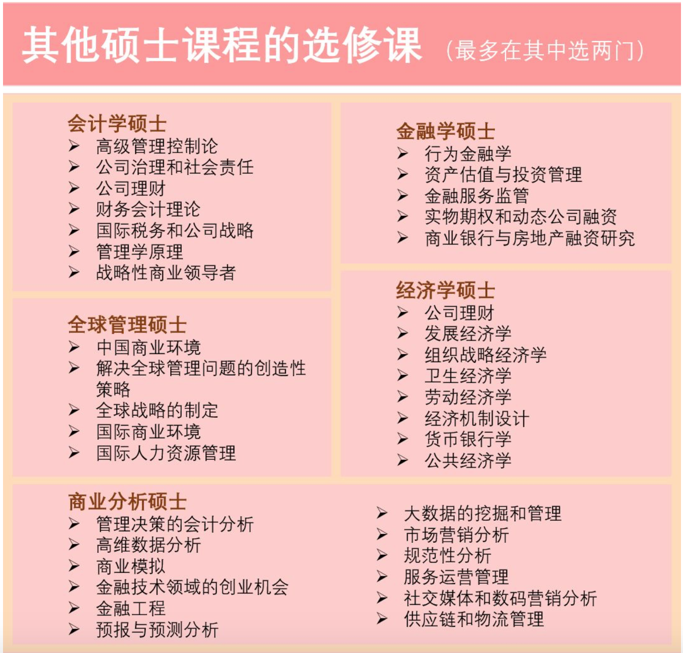 学生需要完成至少10门课程,包括5门专业核心课程和5门选修课。学生可以根据自己的学习兴趣和职业规划,选择本专业以及学院其他硕士项目的选修课。
