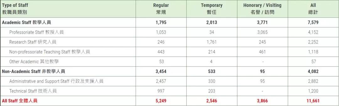 *以上表列的教职员数目并不包括受聘于大学成立的公司的雇员及时薪员工。