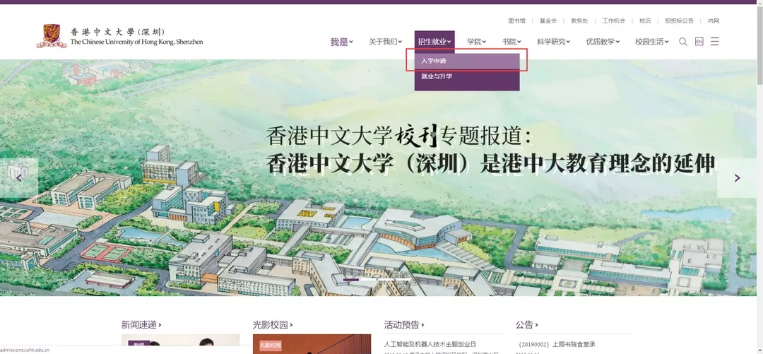 第一步:打开香港中文大学(深圳)官网http://www.cuhk.edu.cn/,点击【招生就业-入学申请】