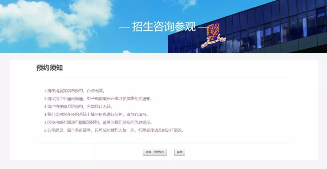 第二步:点击【招生咨询参观-个人预约】,仔细阅读【预约须知】后,点击【同意,我要预约】