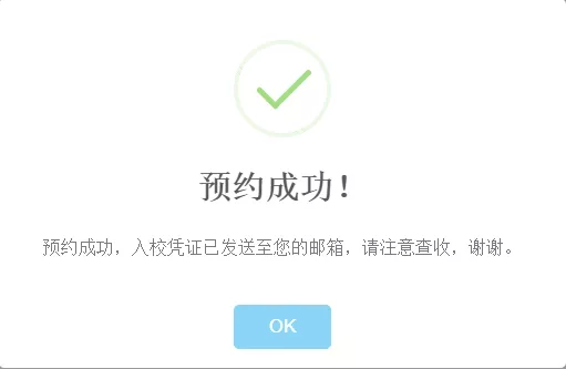 第四步:预约成功后,屏幕会显示报名成功并且发送邮件至您填写的邮箱,请按照邮件内容说明准时到达,点击【校园地图】可以查看学校地图