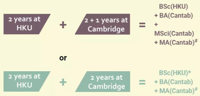 入选「香港大学-剑桥大学本科招生计划(自然科学)」的学生5年学成后,将分别获得香港大学颁发的理学士、剑桥大学文学士、理科硕士及文学硕士#。学生将在香港大学理学院学习2年,成功通过考核的学生将前往剑桥大学攻读自然科学方向本科及硕士合共3年的课程。学生亦可选择只修读4年本科课程,他们将获得港大理学士、剑桥文学士及文学硕士#。