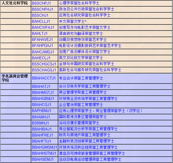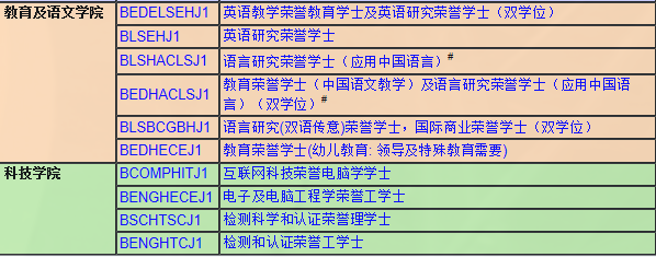 对比图1、2的区别,香港公开大学在2020年内地招生中将在除教育及语文学院外的其他三个学院都新增了一些专业,特别是科技学院差不多增加了一倍的招生专业。2020年共开设43个本科专业在内地招生,具体情况可见下图。