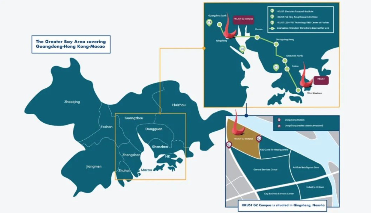 香港科技大学(广州)选址在广州市自贸区南沙片区庆盛火车站附近,乘车从香港西九龙站到庆盛站只需30分钟。同时规划显示,广州地铁四号线将行经港科大(广州)。新校园占地约1.13平方公里,面积约是香港清水湾校区的2倍。