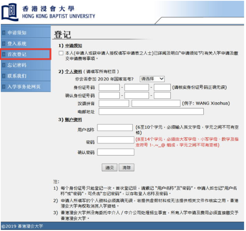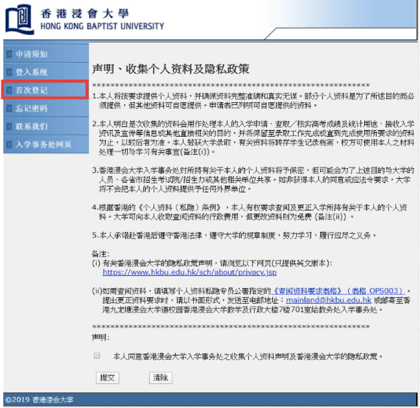 1. 登记前,请先仔细阅读及同意香港浸会大学入学事务处之收集个人资料声明及香港浸会大学的隐私政策。