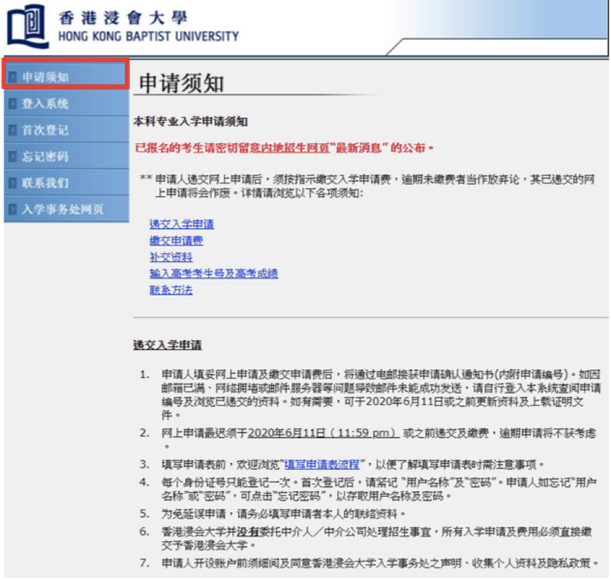 香港浸会大学采取独立招生,没有参加内地统招,31省市区的应届高考生(包括复读生)可申请入学,有意报读者须直接向大学递交入学申请。国家教育部规定,香港高校在内地自主招生必须在7月7日或以前完成录取;所有已确认接受录取的同学,内地高校将不再录取。