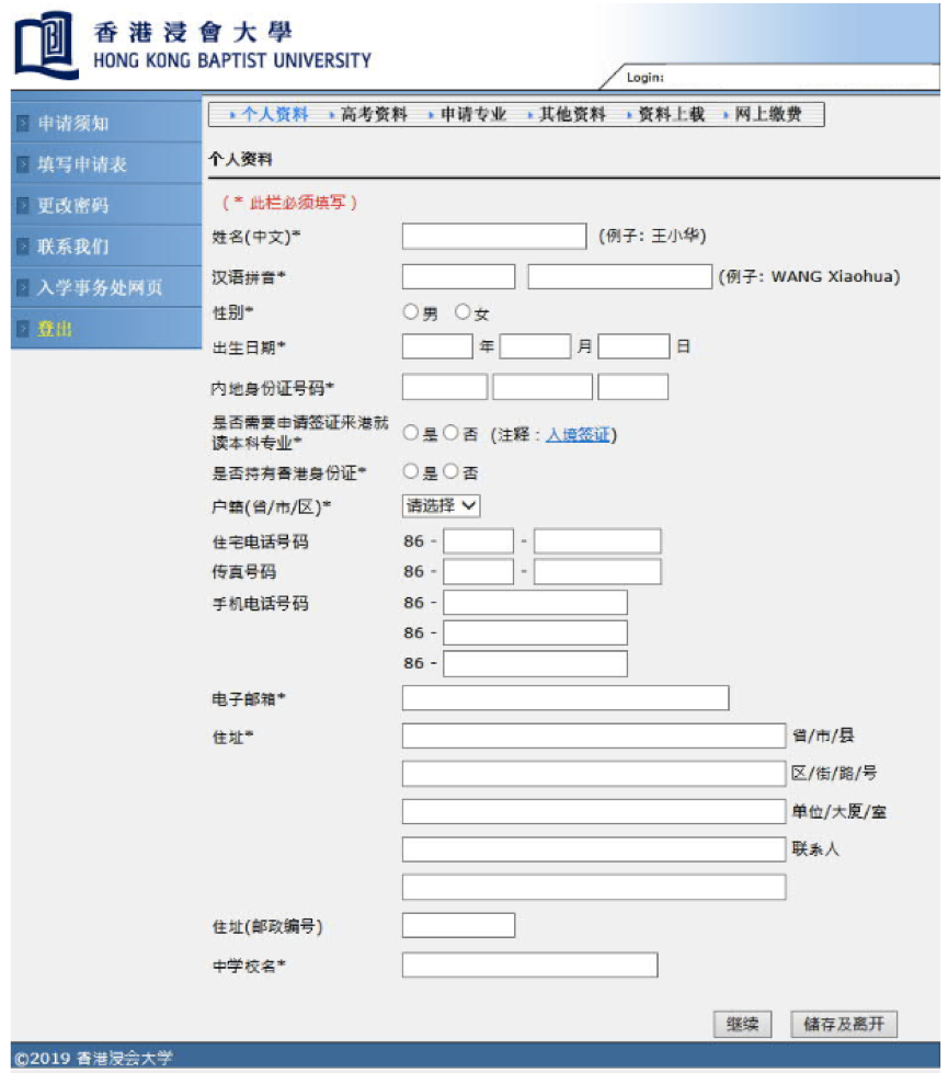 6. 申请人须逐一填上每项栏位要求的资料。填妥每一版面后,请点击“继续”以进入另一版面;若 填写申请表期间须暂时离开系统,请先点击“储存及离开”,以储存已填写的资料。