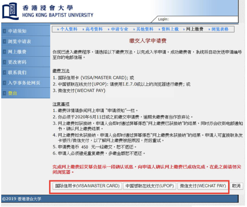 11.申请人点击“填妥表格及前往缴费”后,将进入缴费程序。请选择以国际信用卡 (VISA/MASTER CARD)、中国银联在线支付(UPOP) 或微信支付(WECHAT PAY)缴费。如未能于限期前缴费,则 当作放弃申请论。申请人如透过不同途径缴费多于一次者,将不获退还多交的费用。