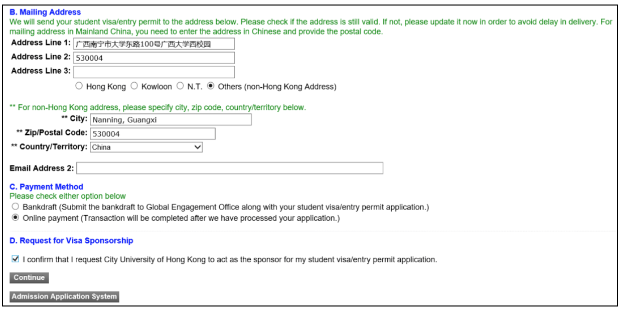 这里的邮寄地址很重要,这就是学校到时候给你寄送的地址依据,中国内地的地址用中文填写,记得加上邮编。请确保这个地址在5-8月期间都可以收到快递。最后选择费用支付方式,可以选择在线支付或者汇票两种方式。建议选择在线支付比较方便。如果选择在线支付,则学校审核完你的材料之后再支付即可。如果选择汇票,则需要在邮寄材料的时候将汇票一起寄送给学校。