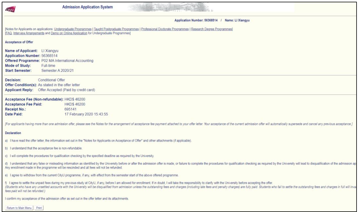 其实就是大家交完留位费后出的一个证明。如果是在网上通过信用卡缴费,登录网申系统, 点击Offer Accepted (Paid by credit card),打印页面即可。