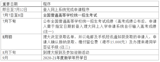 理大本科课程现已接受报名,同学们可以通过理大的网上报名系统直接填表申请,网址为www.polyu.edu.hk/study,进入此网站后请选择“UNDERGRADUATE (NON-LOCAL)”,再选择“内地应届高考生”的平台进入申请。申请费是港币450元。截至报名时间为2020年7月12日。