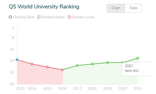 今年QS共评估了来自全世界80个国家与地区超过5000所大学院校,港大较去年排名升3位,位列22,其中学术声誉、国际学生比例及国际教员比例得分均超过98分,其中国际教员比例更是维持在100分。