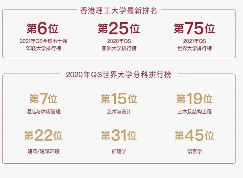 香港理工大学有逾八十年的辉煌历史,是世界一流的研究型大学,跻身全球百强学府之列,最新的世界排名进一步跃升至第75位!理大在教育,科研和知识转移等方面不断追求卓越,在多个学术领域领先世界。香港理工本科课程网上报名网址:https://www51.polyu.edu.hk/eprospectus/ug/jee